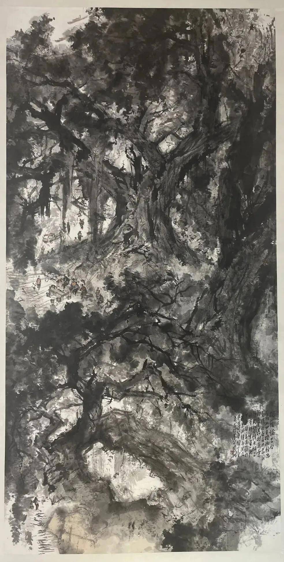 人的温度:人文片刻亦是创作灵感来源。他曾蹲在村口观察人来人往,村口的三株榕树合抱生长,树冠连为一体,形成巨大的树荫,人们在树下乘凉、休闲,这一幕化作《澄海霞寨村》系列里充满生活质感的笔触;霞寨村是画家夫人外婆家,他们每年都会陪老母亲回老家走走探探亲友,当地淳朴的民风、乡情早就融入了画家的艺术情结,让水墨成为“烟火气”的生活切片,而《陈慈黉故居之一》还描绘了潮汕英歌舞场景,这两年走红网络,让潮汕魂在画中鲜活。