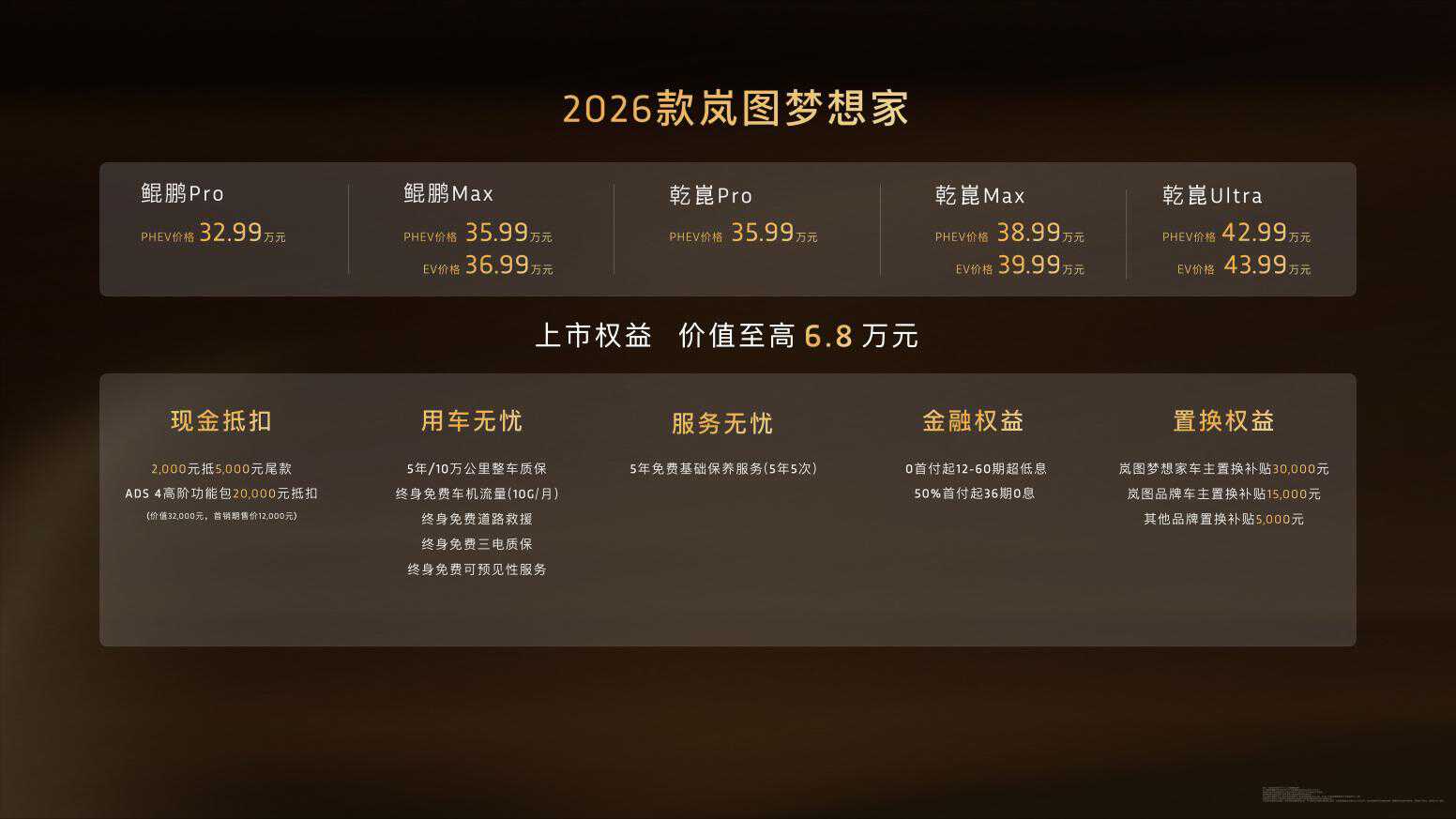 2025年9月15日,2026款岚图梦想家正式宣布上市。新车推出鲲鹏与乾崑两大智能化系列,共五大配置版型,提供PHEV和EV两种动力模式,官方指导价格区间为32.99万元至43.99万元。