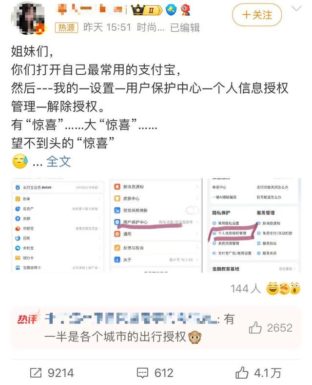 一位博主建议大家打开支付宝,查看“个人信息授权管理”,称有望不到头的“惊喜”,同时呼吁顺便查下“免密支付/自动扣款”。