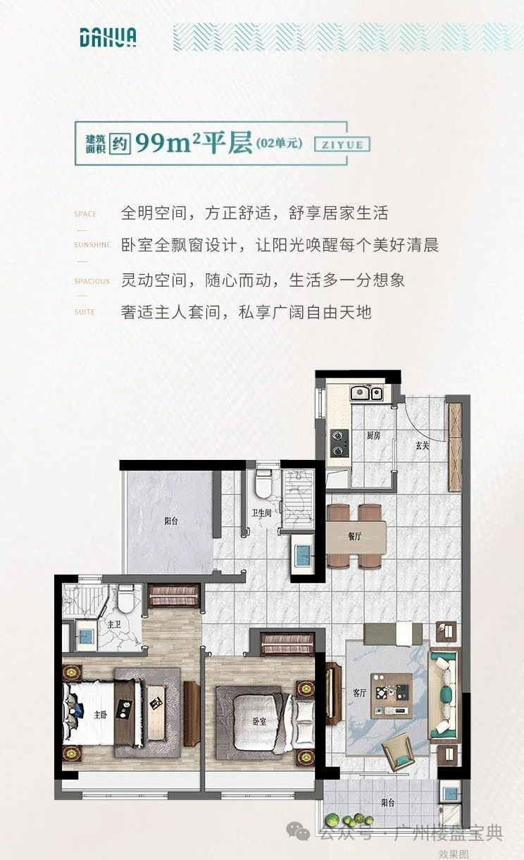 建面约126㎡平层三房户型,面积相对较大,整体空间较为阔绰。屋内配置双阳台设计,南北对流,通风采光无遮挡;卧室均为全飘窗设计,主卧则是大套间配置,居住舒适度较高。