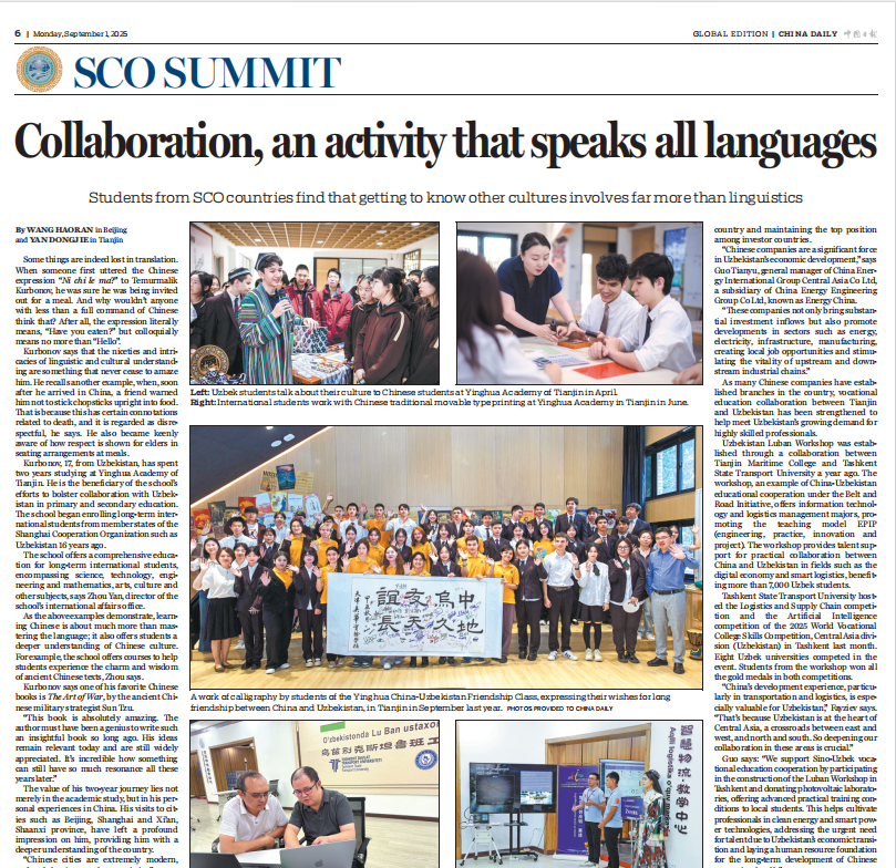 China Daily's special edition on the Shanghai Cooperation Organization (SCO) Summit highlighted our school's "China-Uzbekistan Friendship Class" educational cooperation program.