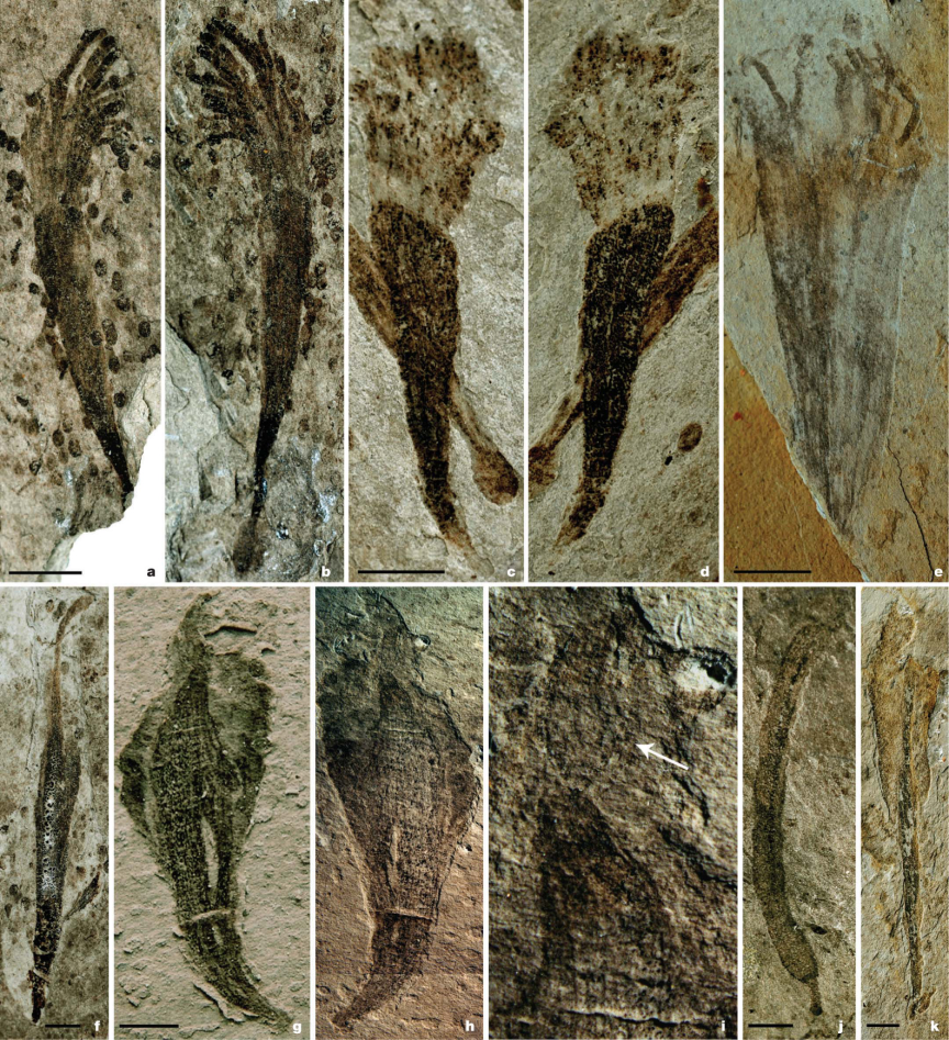 图6 蓝田生物群中的单一类群的居群。 图中化石均保存在同一块页岩表面,是同期生活的化石生物。具固着器,底栖固着生长;它们的大小和形态基本相同, 应该是同一个种的生物,很可能属于有性繁殖产生的同一子代的居群。(比例尺2 cm)