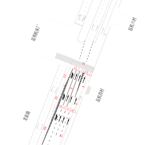 龙泉路与昆明机床厂、昆机四村交叉口现状北进口设置有4条车道,一条左转带掉头车道,三条直行车道,南出口设置有三条直行车道。