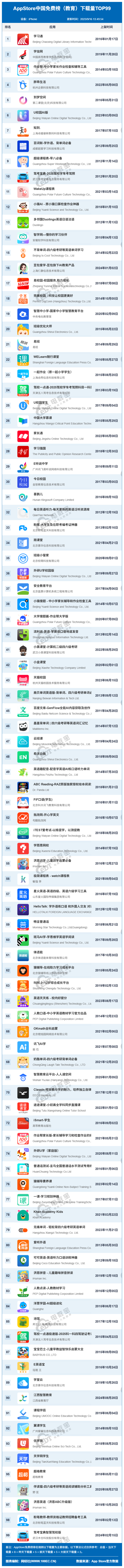 排在21-30 名的依次为:易班、WELearn随行课堂、一起作业(原一起小学学生)、驾校一点通、U校园学生、中国大学慕课、家长通、学习强国、E听说中学、今日校园;
