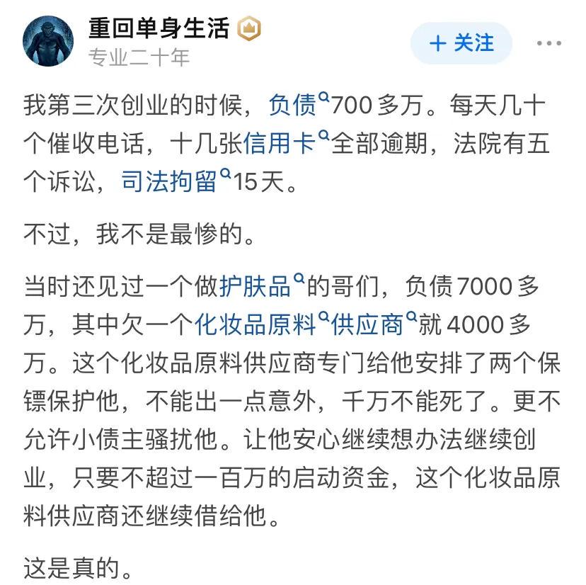 负债40多个,实践告诉自己,没钱真的不要创业,更不要借钱贷款创业,真想创业,自己有多少钱就玩多大的盘,失败了最多清零,也不会负债累累