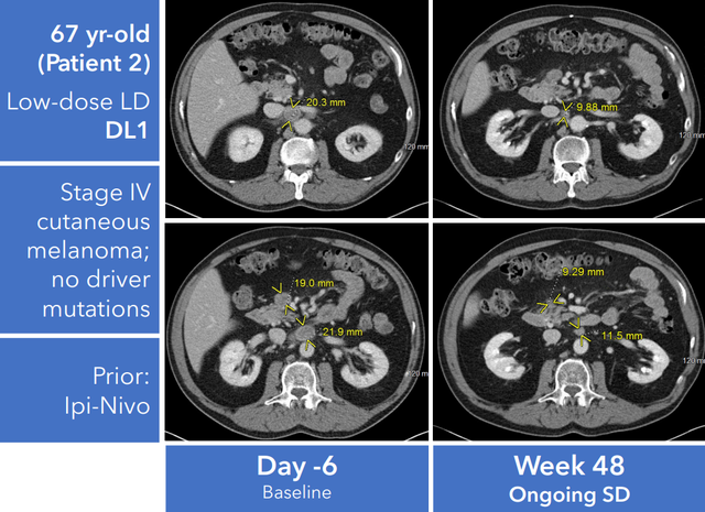 一名67岁的晚期黑色素瘤患者,在接OBX-115治疗48天后,肿瘤显著缩小,实现病情稳定(SD)。