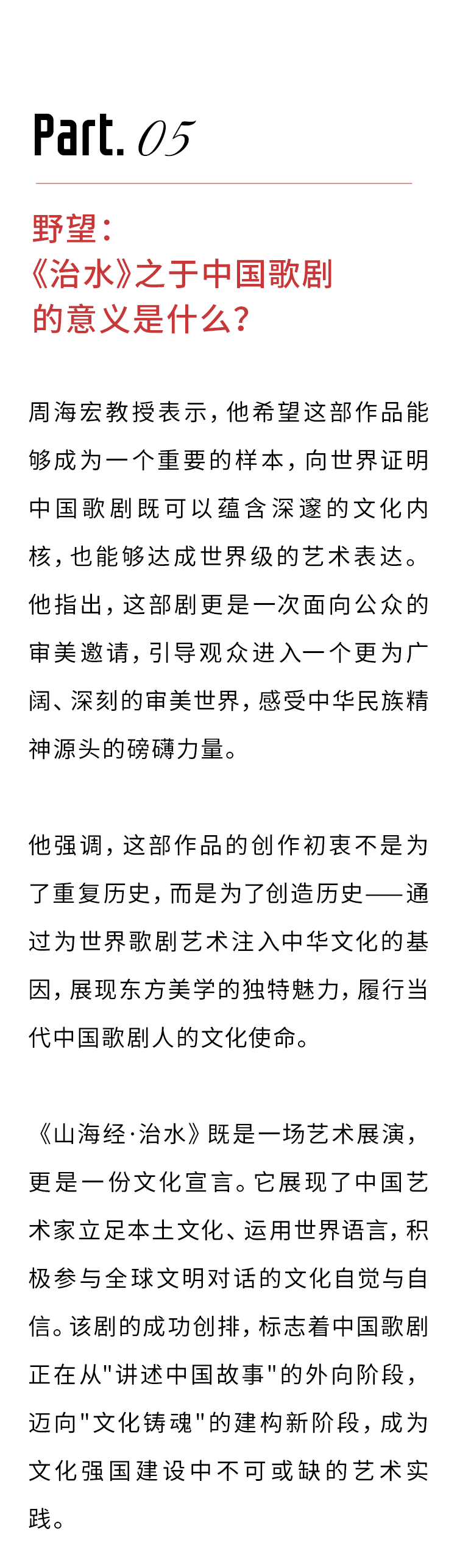 “这部戏,或许是为未来写的。”面对笔者的采访,著名音乐美学家、教育学家、歌剧《山海经·治水》编剧周海宏教授这样说道。2025年10月2日,这部被其称为联套歌剧的开创性作品即将在中央音乐学院歌剧厅首演。作为联套歌剧《山海经》四部曲中的关键一环,这部作品不仅承载着中国歌剧人定义自身艺术范式的雄心,更彰显着文化自信与文化强国的时代强音。本次访谈中,周海宏教授深入剖析了创作初衷、艺术突破与文化使命。