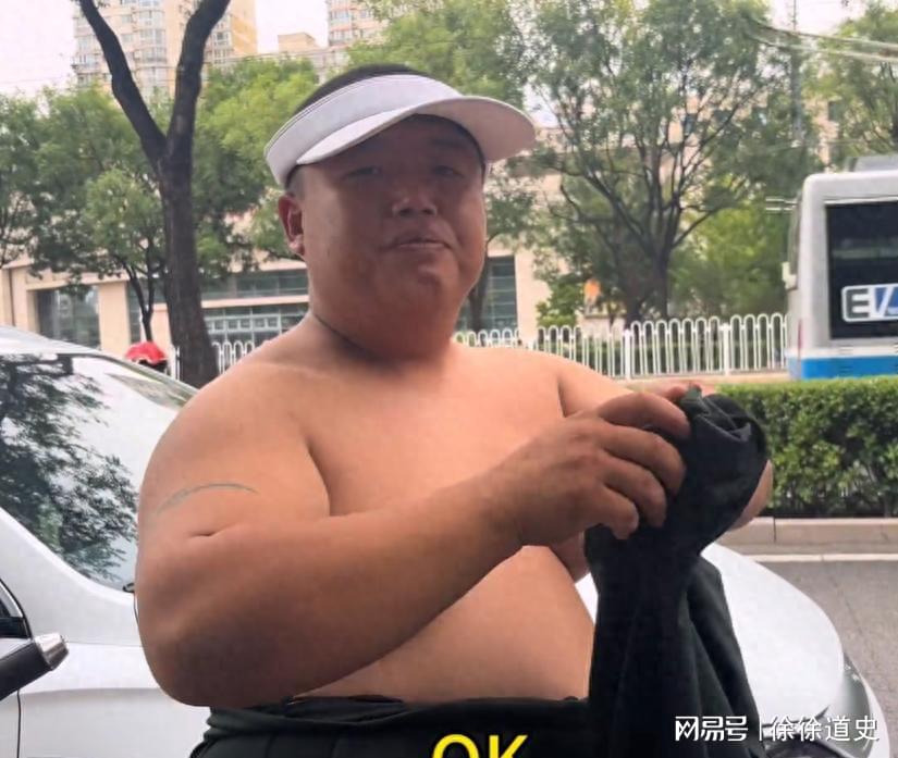 蓝衣大爷要求男子必须把车弄起来,可谁知男子居然当众开始唱歌,甚至脱下了上衣光着膀子。