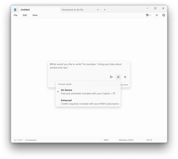如今记事本借助本地AI模型,用户无需登录微软账户或订阅Microsoft 365,甚至无需联网,因为所有处理都在本地完成,利用的是Copilot+电脑上的NPU,不过这也意味着该功能需要在Copilot+电脑上才能使用。