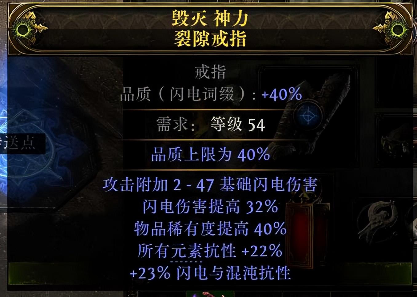 找底材-前缀稀有度 后缀15以上所有元素抗性,点精华-强化丰裕精华(必定出在后缀),亵渎后缀-右旋死灵预兆+至高预兆+遗存锁骨 必出闪电混沌复合抗(先不选避免混沌抗污染词缀池),打品质-打满40%艾许催化剂,点前缀-强效崇高预兆+同质化崇高预兆+催化崇高预兆+完美崇高石(同质化保证只会出现元素词缀,催化剂提高闪电相关词缀权重,这样大概有6成概率出两条闪电词缀即闪电点伤与闪电伤害提高,但T阶比较看脸),这个方法不是必定成功,脸黑可能需要点两手才能保证词条全对,而且T阶很不稳定,所以这颗戒指制作成本很高,量力而行。再次打品质-打满40%艾许催化剂,并且解亵渎拿闪电混沌复合抗性后缀。