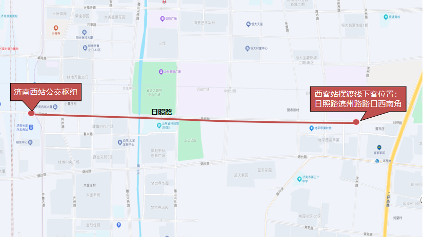 由济南西站公交枢纽发车,沿日照路向东至日照路滨州路路口西南角。