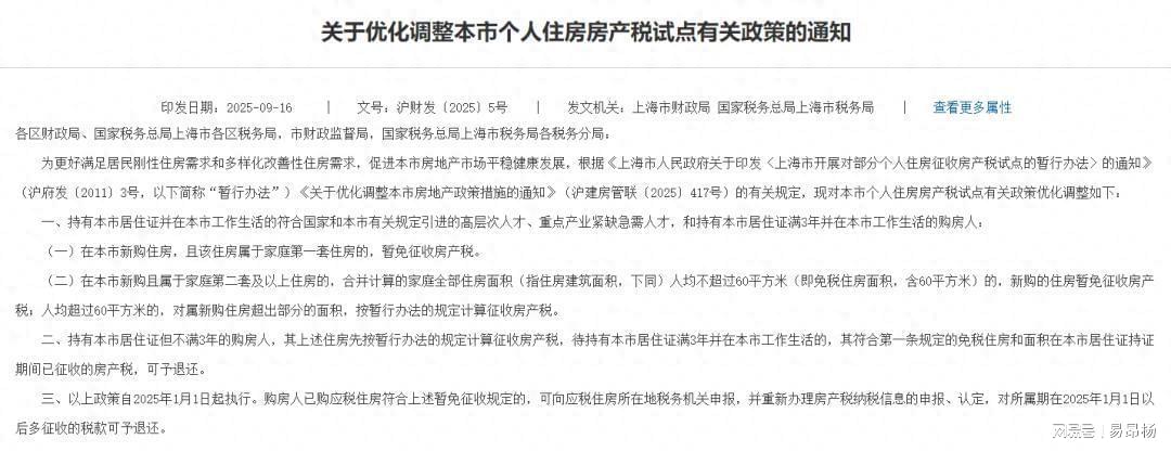 刚刚!上海发布了《关于优化调整本市个人住房房产税试点有关政策的通知》,作为“825新政”中的一点,此次算是发布政策细则,其中提到: