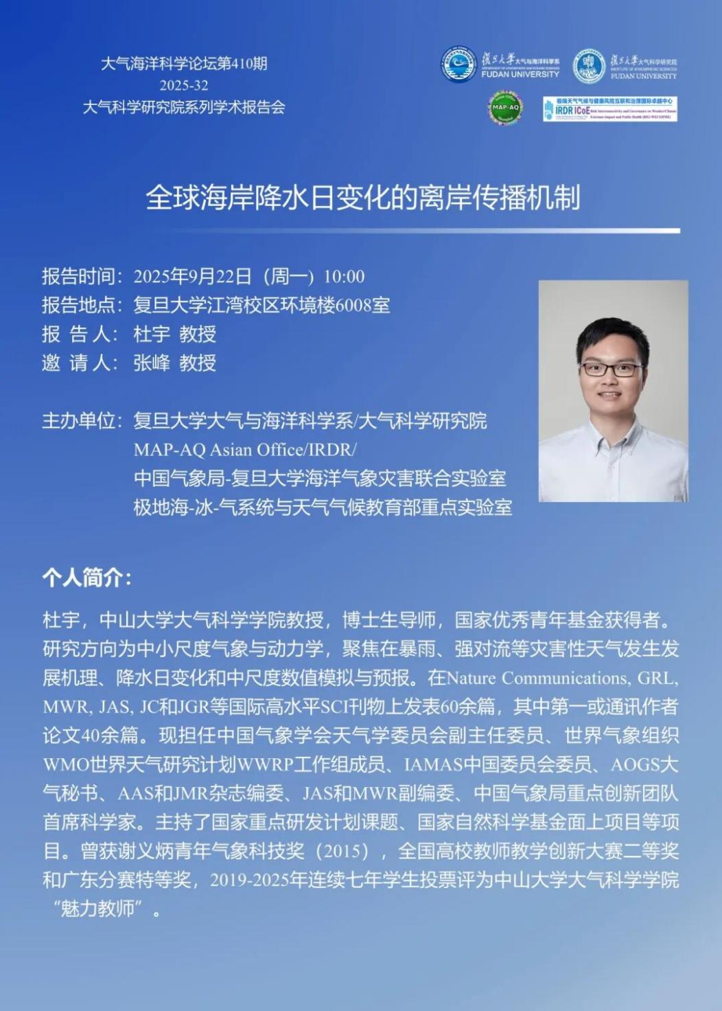 主办:复旦大学大气与海洋科学系、大气科学研究院MAP-AQAsian Office、IRDR、中国气象局-复旦大学海洋气象灾害联合实验室、极地海-冰-气系统与天气气候教育部重点实验室