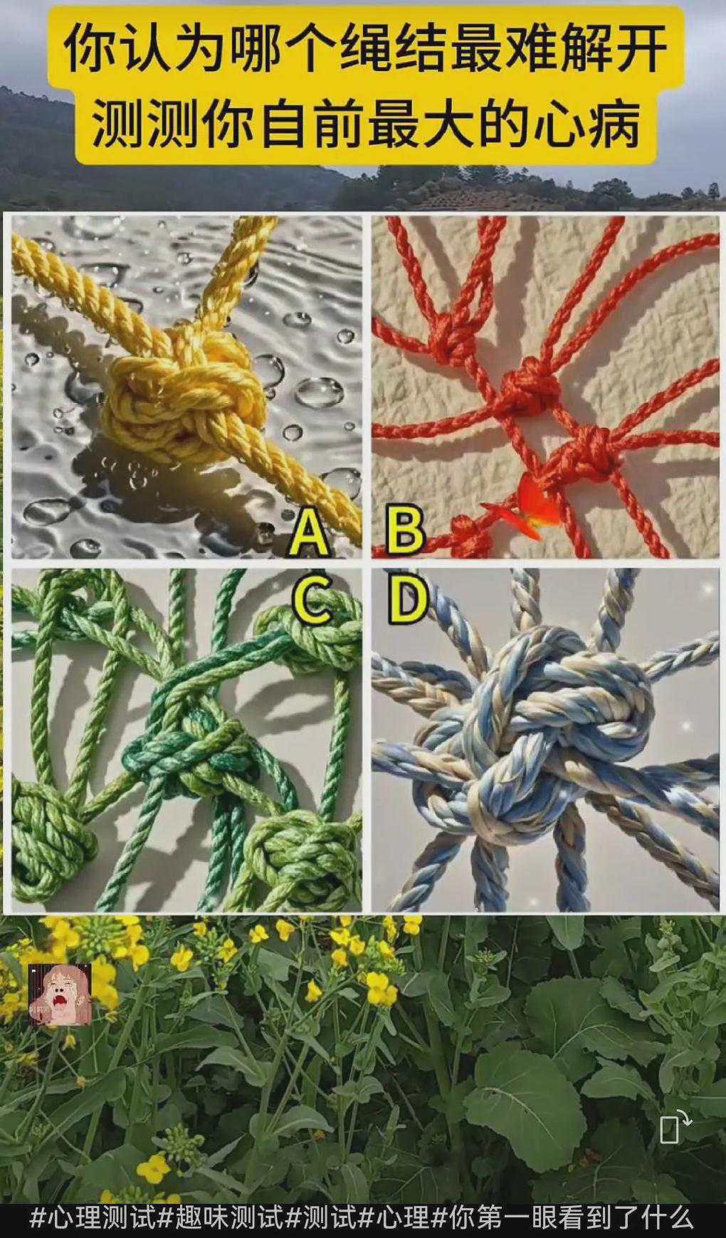 B.这或许表明你当下最大的心病是对未来方向的迷茫。绳结的交错好似你脑海中各种想法和可能性的碰撞,面对学业选择、职业发展、人生规划等重大问题,你有诸多设想却又难以抉择,不知哪条道路才是最适合自己的,心中满是困惑与不安。请你留下一句话加持你的福气:前程似锦。