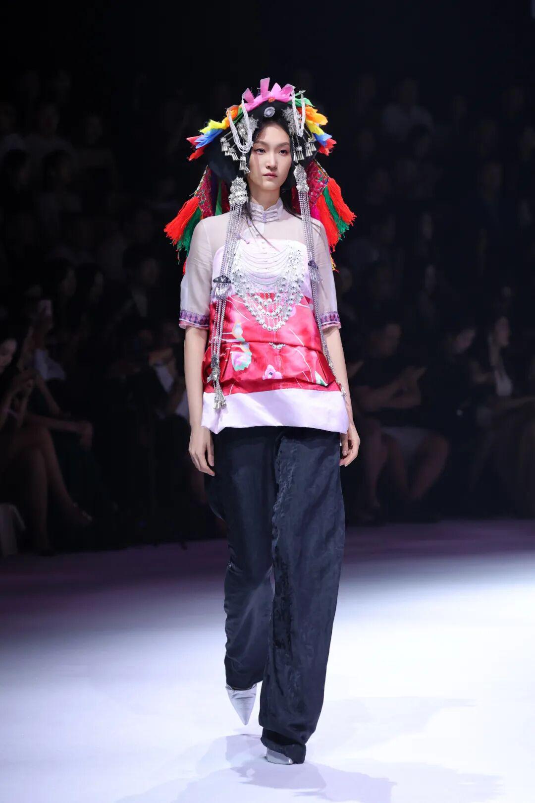 设计师陈宇对黄斗笠、花头巾、短上衣、宽筒裤、银腰带等传统惠女服饰元素进行解构重塑,以现代剪裁、创新面料与色彩组合焕发新生。