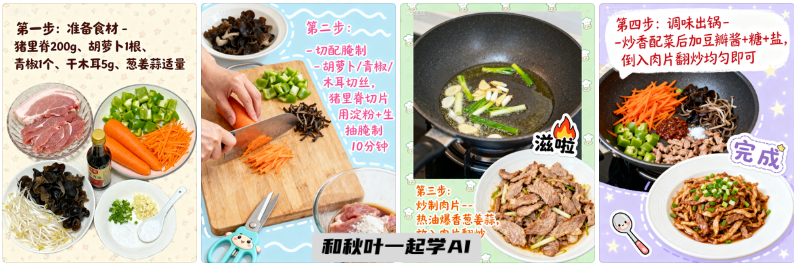 ❹步骤图生成:手账风格,出一个鱼香肉丝制作步骤教程图,步骤说明要中文。