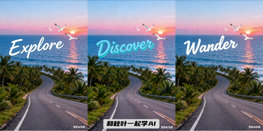 ❿字体风格海报:图片背景不变,生成 3 张海报,标题文字分别为「Explore」「Wander」「Discover」,每张采用不同的手写字体,整体风格轻松自由,带有旅行感。