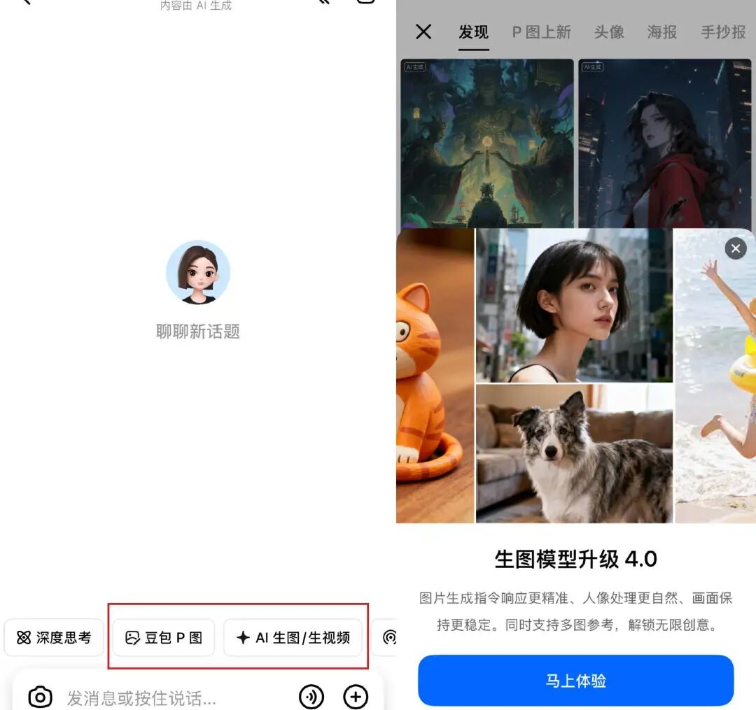 ✅打开手机 APP -选择「豆包 P 图」、「 AI 生图/生视频」都可以体验。
