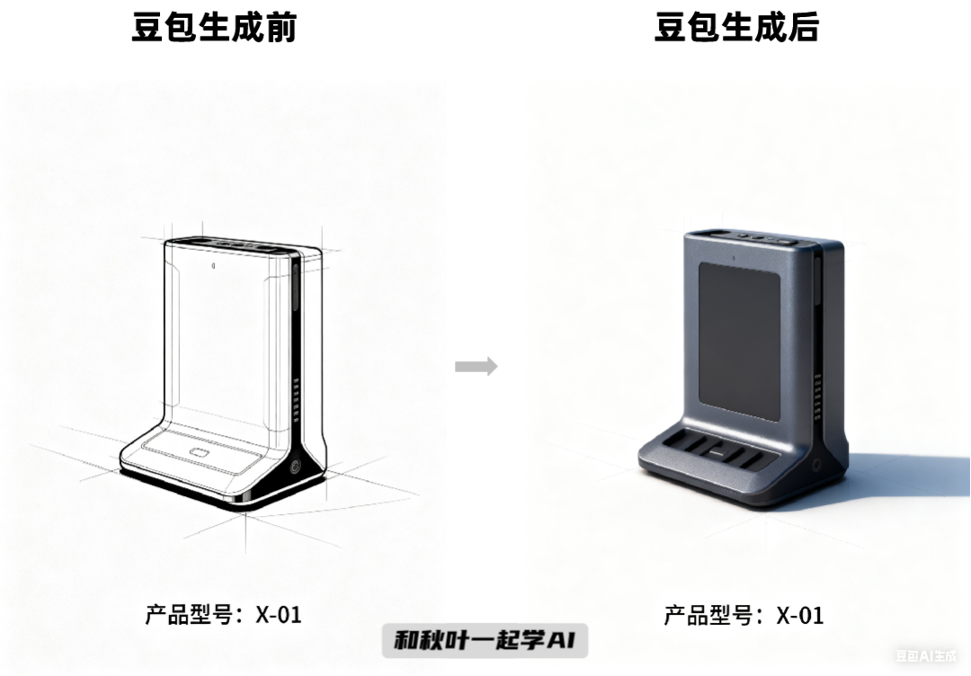 ❹线稿立体渲染:为产品线稿添加光影与材质,生成立体 C4D 风格渲染图,画面精致逼真。
