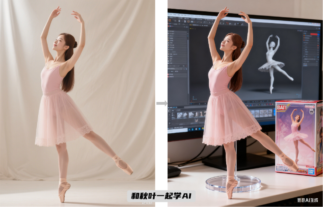 ❿3D 写实模型:生成主体的 1/7 比例商用模型,写实风格,放置在电脑桌上。底座为圆形透明亚克力。电脑屏幕显示 ZBrush 建模过程,旁边放置 BANDAI 风格玩具盒,盒面印有原图主体。