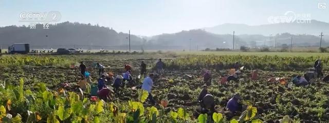 在江西铅山县永平镇红芽芋基地,连片种植的芋头纵横交错地生长着。村民们在田地里挖芋头、削枝叶、除根须、装袋,忙得热火朝天。