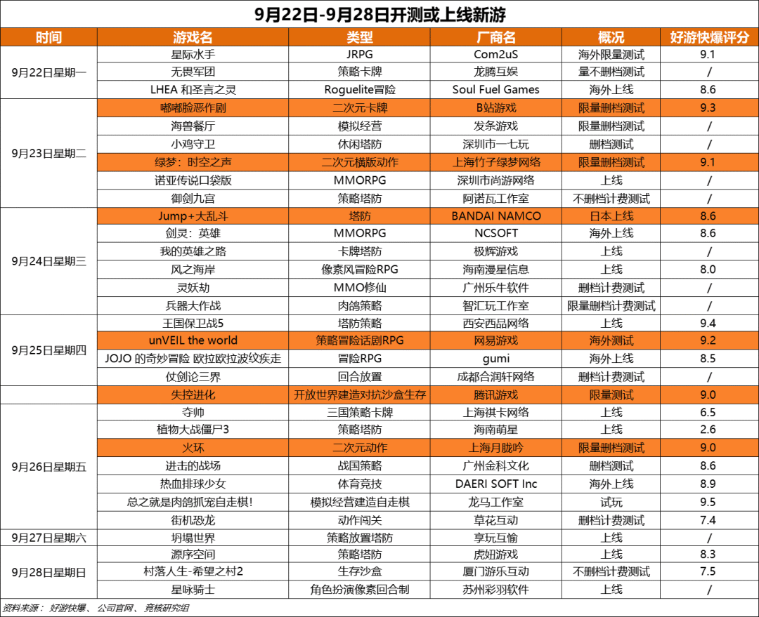 下周(9月22日-9月28日)开测新游: