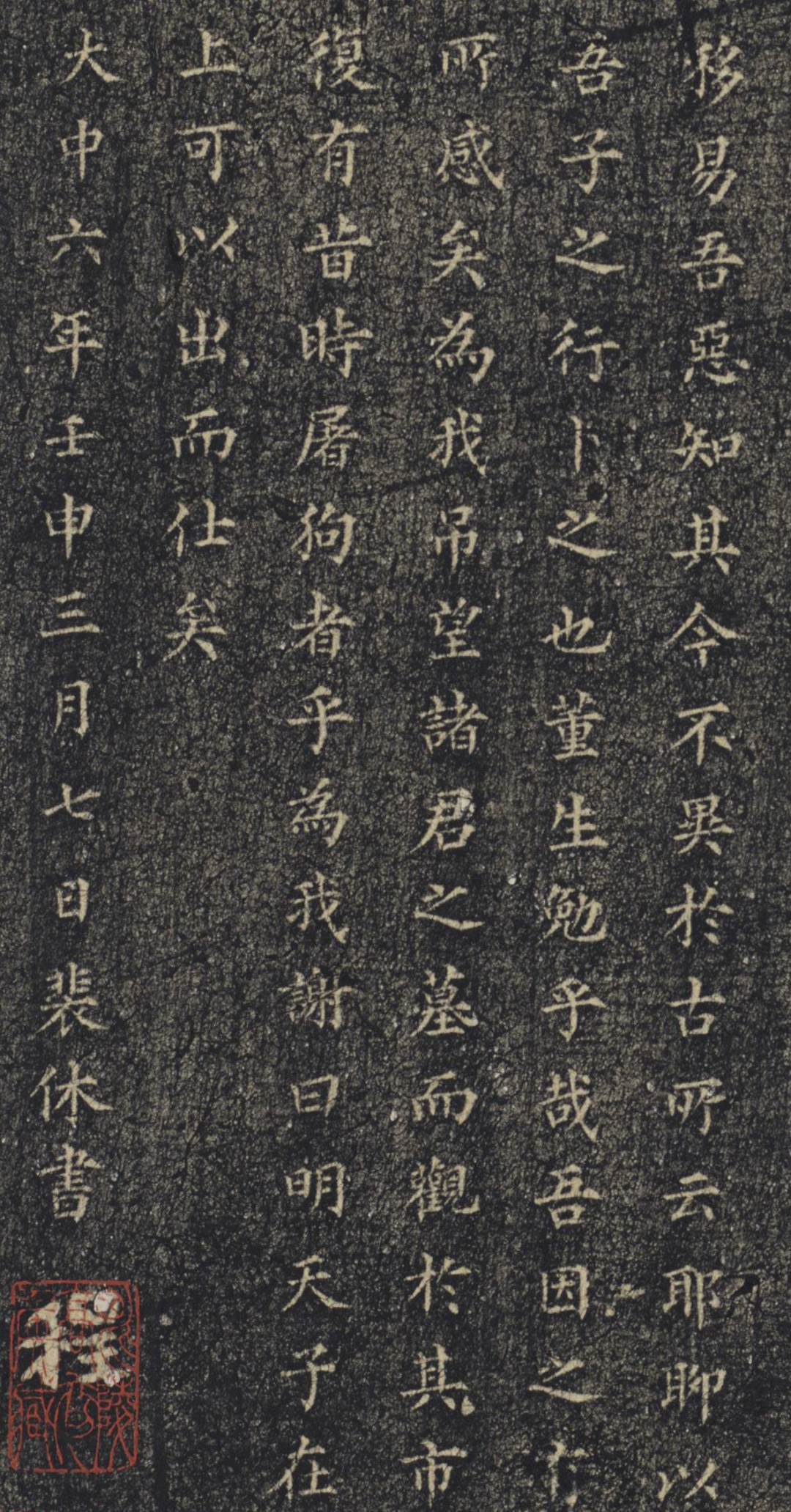 裴休的楷书是率意而天成的,在关于《书林纪事》当中记载: “镇太原时,太山建化成寺,寺僧粉额陈笔砚以俟休。 休神色自若,以衣袖墨书之,极遒健”。 他能够自然到以袖作书,可见其书法的功力和天然之态! 裴休留给后世的作品极少,这也是他书法的影响力不及柳公权的一个原因!