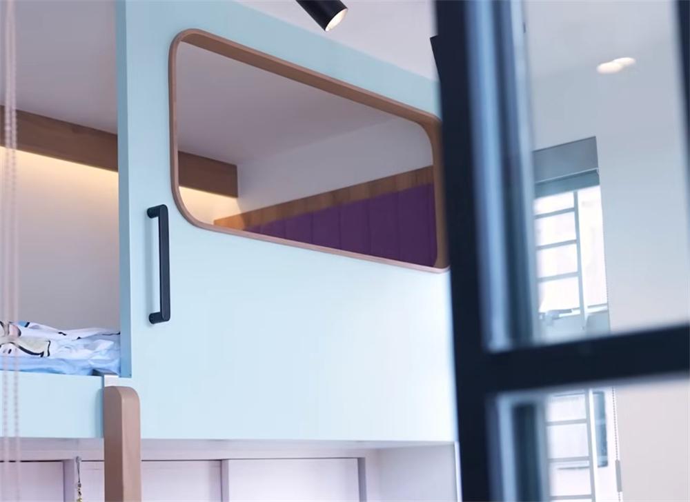 阁楼式的上下铺儿童房,上半部分是一张小小的睡床,它和菲佣所住的柜子其实差不多,但要略宽一点点,侧边掏空出一个长方形的窗户,搭配儿童房内的灯带进行采光照明和通风。