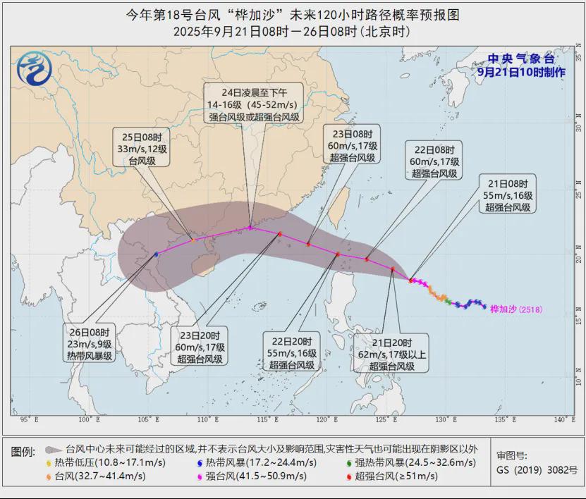 预计,“桦加沙”将以每小时15-20公里的速度继续向西偏北方向移动,强度还将有所增强,最强可达17级以上(62米/秒),22日穿过巴士海峡后,将于23日凌晨进入南海东北部海面,并将在24日凌晨至下午在广东沿海登陆,预计登陆时强度可达强台风级或超强台风级(14-16级,45-52米/秒)。之后,“桦加沙”将穿过雷州半岛进入北部湾海面,强度逐渐减弱。