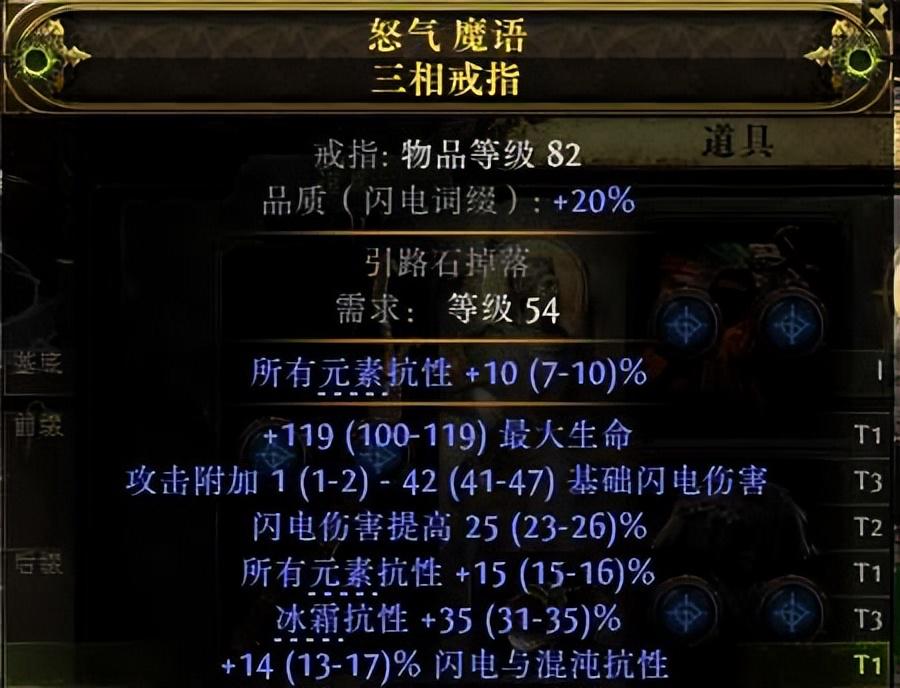 然后是戒指,前缀电点伤,电inc,生命值(可以换成稀有度),双点伤加inc也无所谓。后缀就是抗性,稀有度,属性你自己搭配。