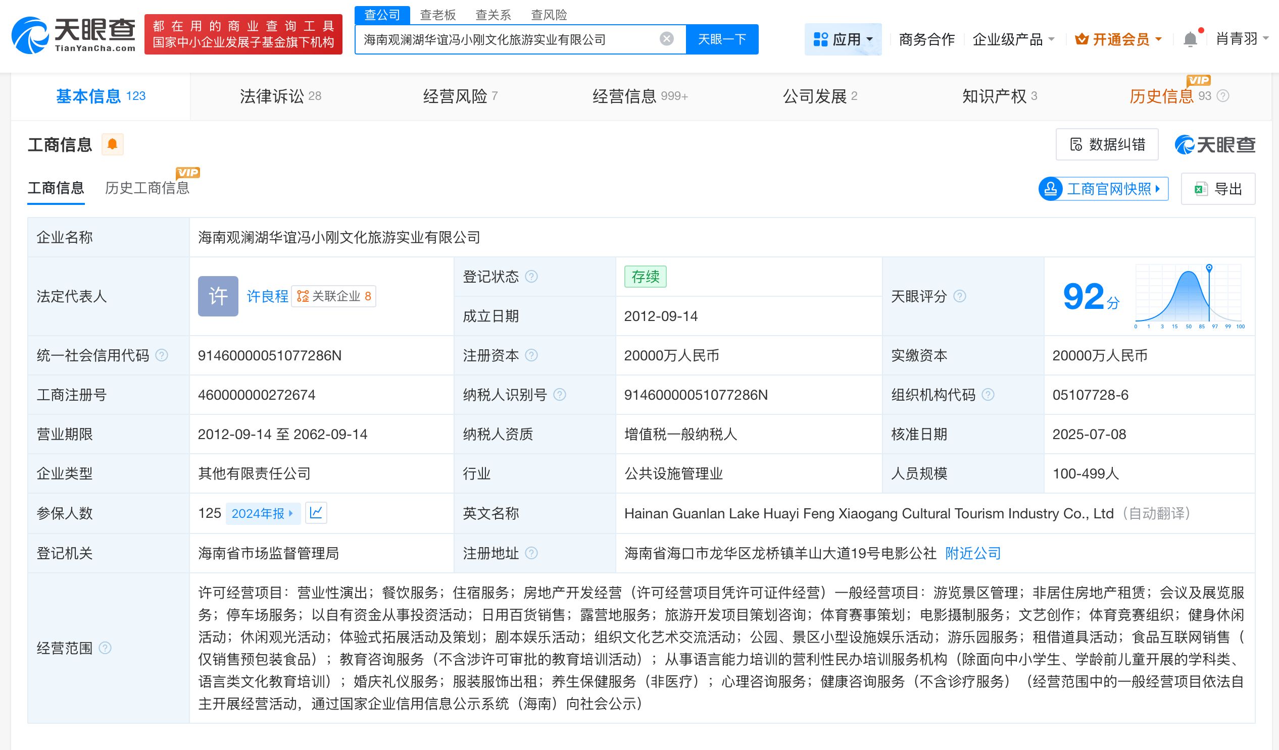 天眼查工商信息显示,海南观澜湖华谊冯小刚文化旅游实业有限公司成立于2012年9月,法定代表人为许良程,注册资本2亿人民币,经营范围包括营业性演出、餐饮服务、住宿服务、房地产开发经营等。股权全景穿透图显示,该公司由海口富岸源实业有限公司、上海览盛企业管理有限公司、冯小刚名下北京一帆风顺影视文化工作室等共同持股。