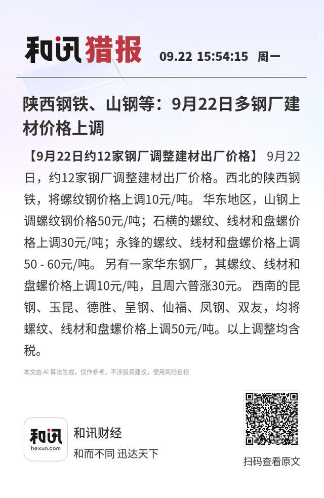 【9月22日约12家钢厂调整建材出厂价格】9月22日,约12家钢厂调整建材出厂价格。西北的陕西钢铁,将螺纹钢价格上调10元/吨。 华东地区,山钢上调螺纹钢价格50元/吨;石横的螺纹、线材和盘螺价格上调30元/吨;永锋的螺纹、线材和盘螺价格上调50 - 60元/吨。 另有一家华东钢厂,其螺纹、线材和盘螺价格上调10元/吨,且周六普涨30元。 西南的昆钢、玉昆、德胜、呈钢、仙福、凤钢、双友,均将螺纹、线材和盘螺价格上调50元/吨。以上调整均含税。