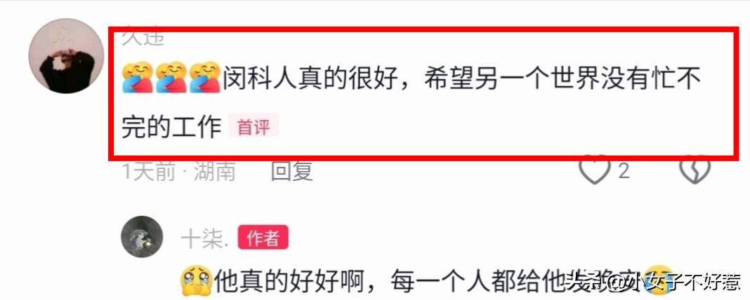 他发布这个作品后,闵宁锋的学生纷纷评论,有的说明明周五还要说评高级教师的,言语之间全是对闵宁锋去世的消息感到意外和悲痛,也有的说,闵科真的是个好老师,前几天还在台上给学生发言,前几天还在跟这位学生面对面说话,闵宁锋老师的突然去世让学生们一时间无法接受,闵科一路走好的评论带着不舍和哭泣,校长并没有说什么,只打了几个双手合十祈祷的表情,更加确定了,校长的四句话是悼念闵宁锋老师的!
