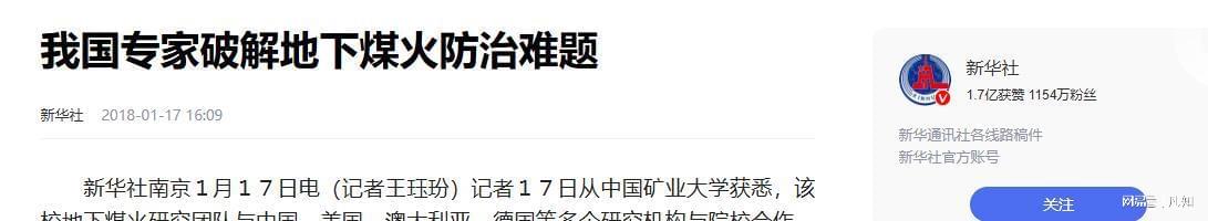 新华社:2018年1月17日《我国专家破解地下煤火防治难题》