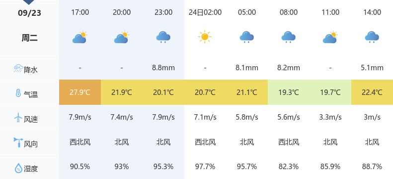 今天是2025年9月23日,鄂州白天天气为多云,夜间转为大雨,北风3~4级,最高气温28℃,最低气温19℃,空气湿度75%,体感温度27.9℃,空气质量优。雨天道路湿滑,公众出行请携带雨具,注意交通安全,避免在低洼路段长时间停留。