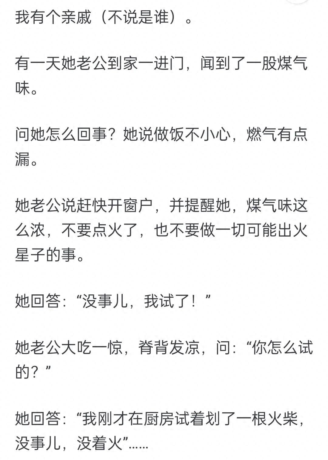我嫂子80后,经常不关煤气,就是那种煤气罐子装的。有次我下班回去,妈呀,一股子很浓的煤气味,不锈钢的灶台很烫手,开窗关下面的阀门一气合成,然后给她打电话,她说我就是矫情,说 你看不是不是没事嘛,有事早爆炸了