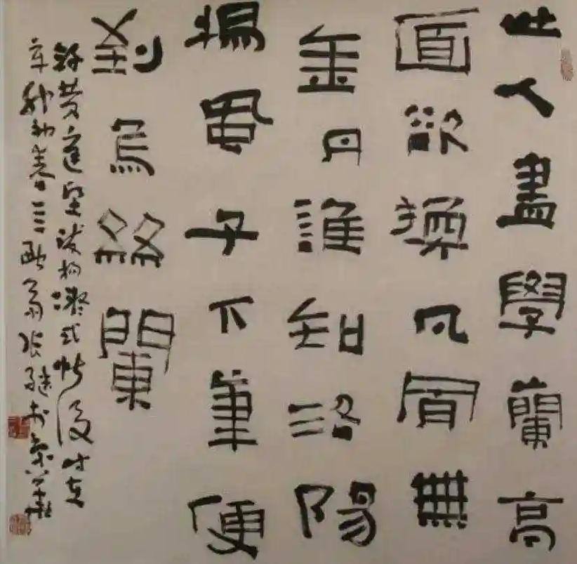 他的隶书以《张迁碑》为本,融通汉隶诸碑,并参以简牍笔意,借鉴绘画美学,形成了沉雄、大气、灵动、多变的个人风格,引领了当代隶书发展的潮流。