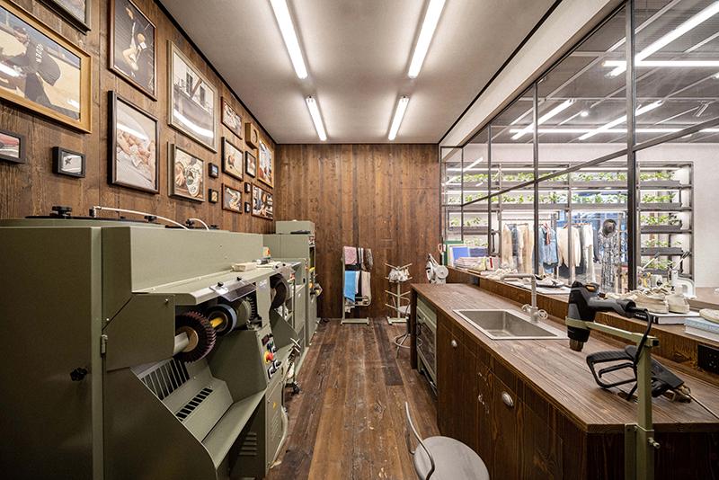 店铺将 DIY、共创作为了关键词,多个区域都强调了产品养护、改造和再利用的体验。其中有 SARTORIA(精裁)区域和“Co-Creation 共创体验”专区,顾客可享受一对一个性化定制服务,比如为产品增加装饰、更换标志性的星星图案,甚至有做旧、刺绣和手绘等工艺服务支持。门店也提供了鞋履定制服务,顾客可以和驻店艺术家 Dream Makers 一起从零开始打造一双完全属于自己的 Golden Goose 原创鞋履。
