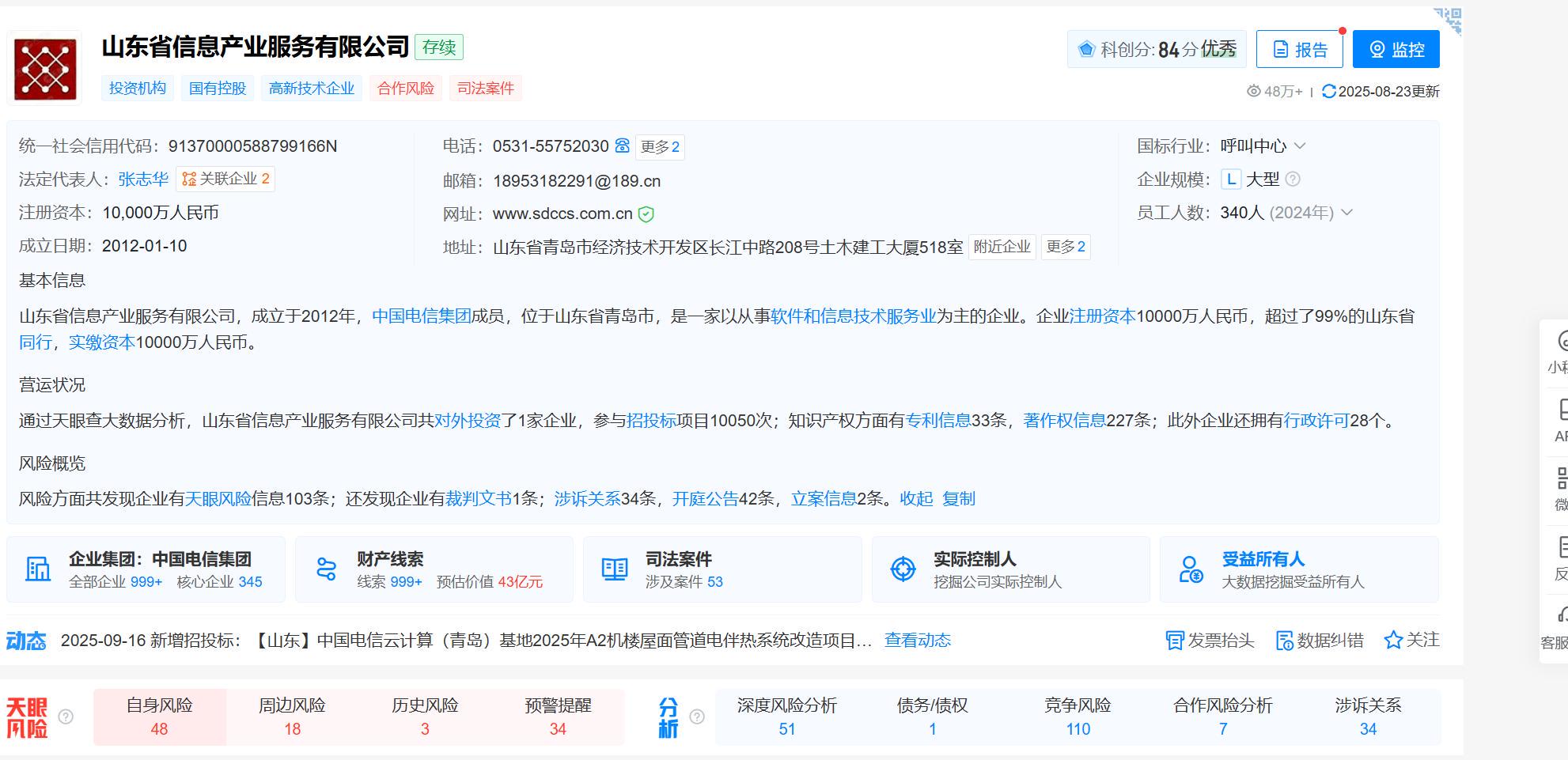 天眼查信息显示,山东信产成立于2012年,位于山东省青岛市,是一家以从事软件和信息技术服务业为主的企业,注册资本1亿元人民币,法定代表人张志华。