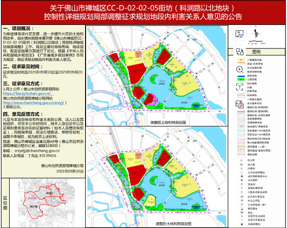 除了上述靓地以外,就在9月初,禅城区政府网站还曾发布了关于《佛山市禅城区CC-D-02-02-05街坊(科润路以北地块)控制性详细规划局部调整》征求规划地段内利害关系人意见的公告。