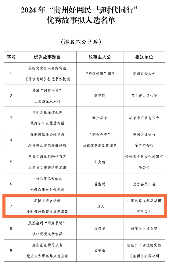兰天,贵阳客运段高京车队B39组列车员,从车厢巡视到查验车票,抑或是提供重点服务,他时刻以标准化作业来保障每一趟列车的安全出行。2025年,他的故事入选2024年“贵州好网民 与时代同行”优秀故事名单。