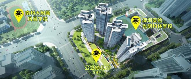 附近还有南方科技大学附属光明凤凰学校、光明区外国语学校,三大学校环伺。(仅供参考,具体入学政策以政府和教育部门发布为准)