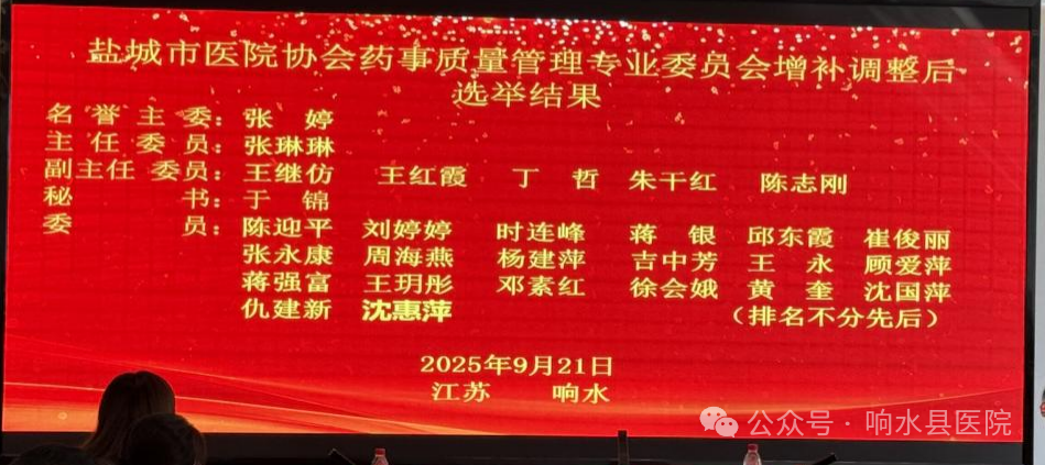 盐城市药事质量管理专业委员会部分委员因年龄、健康、单位岗位调整等原因,无法履行专委会正常工作,根据主委的提议,进行了届中改选调整,产生了新一届市药事质量管理专业委员会委员。经委员大会审议和现场表决通过,新增选8位同志为专业委员会委员,我院药学部主任王继仿同志连任专业委员会副主任委员。此次连任当选,不仅是对他个人工作的肯定,更是对我院药事质量管理水平与学科建设成绩的高度认可和肯定。