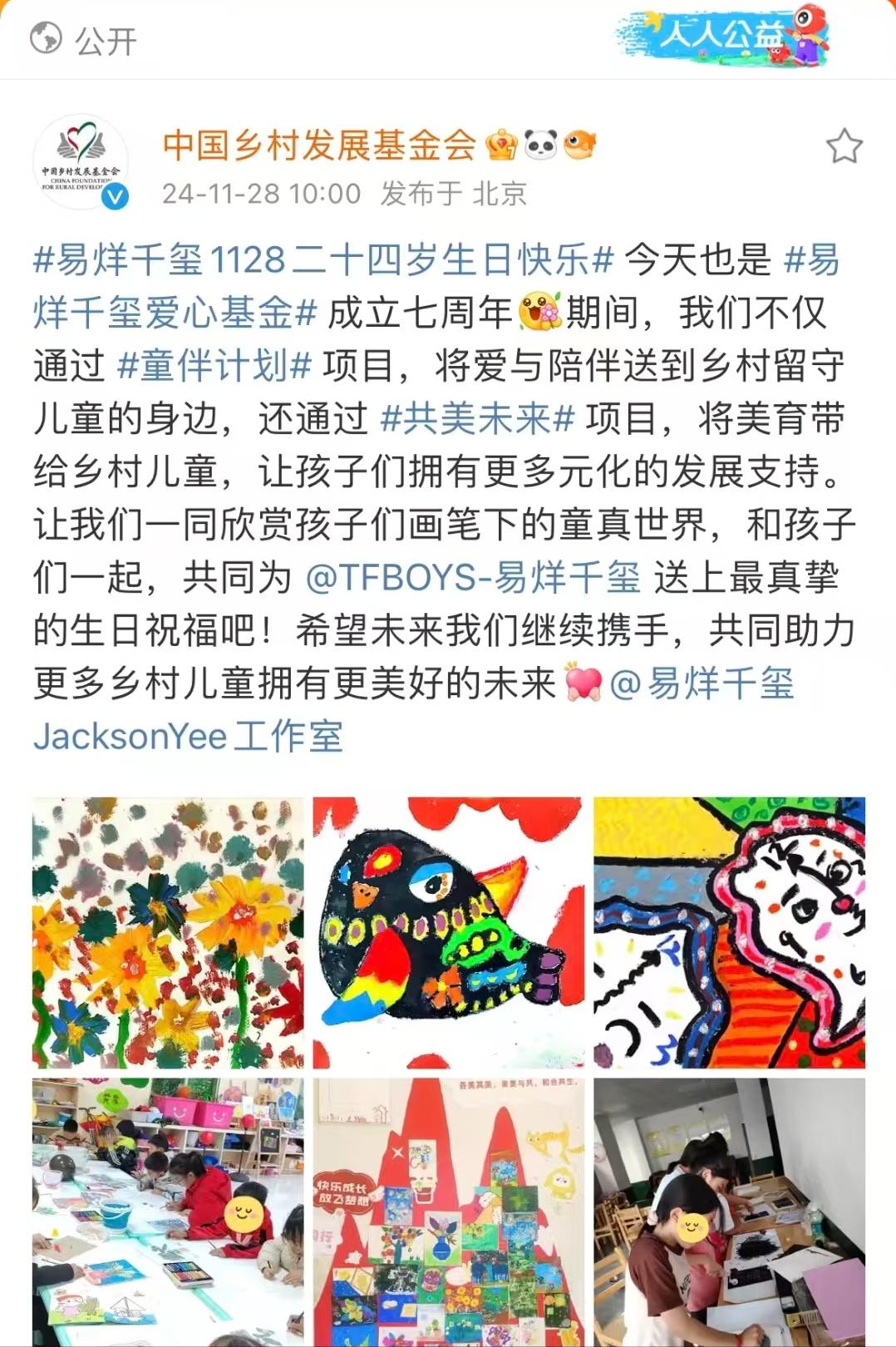 怀着对公益的热忱,他成立了“易烊千玺爱心基金”,和中国扶贫基金会合作,专门帮助农村留守儿童。