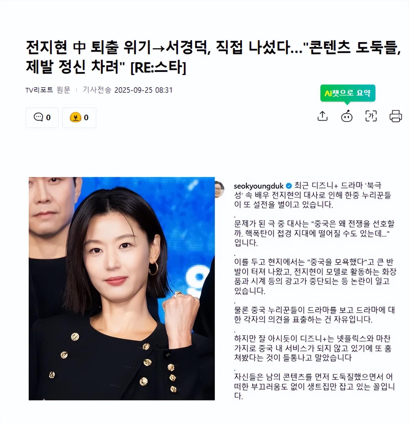 更有部分露脸的韩国媒体,普通话的表示,就算全智贤的新剧台词辱华,中国网民也不能对韩国电视剧指手画脚。