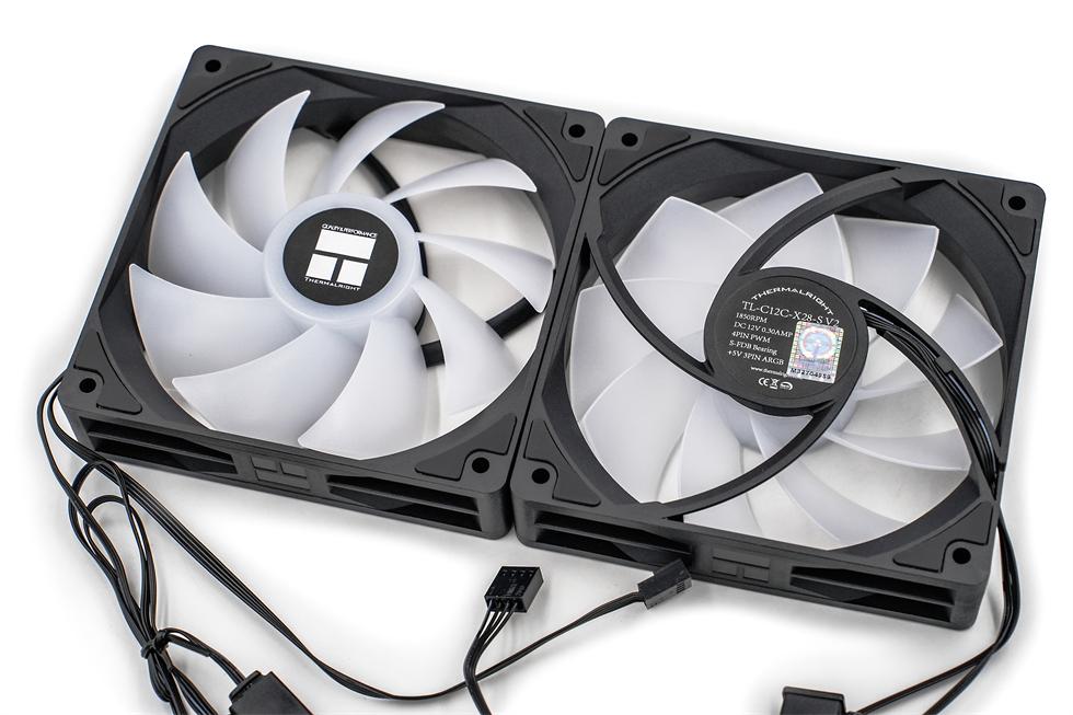 120mm的TL-C12C-X28 V2风扇,28mm厚度,转速1850RPM+10%,88.89CFM的风量,噪音≤29.5dB(A),两个风扇的四角都有减震垫。