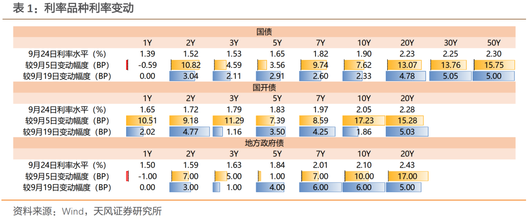 9月5日,关于基金费率调整的征求意见稿发布之后,交易盘抛压加大,对配置盘承接力度形成考验。本周市场对于征求意见稿的讨论再起,债市自周二开始连续下跌,直至周四下午才迎来强势回涨。9月25日,30Y国债活跃券利率最高触及2.1425%,逼近年内高点。