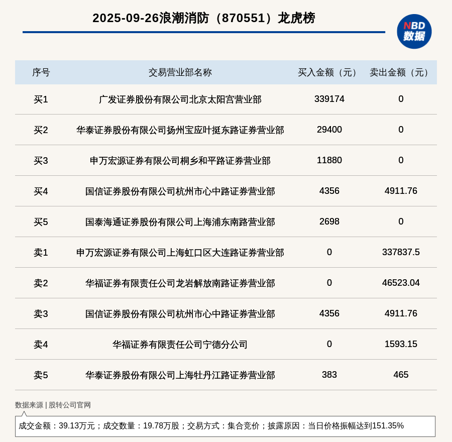 每经讯,2025年9月26日,新三板创新层公司浪潮消防(870551,收盘价:1.95元)登上龙虎榜,交易方式是集合竞价,披露原因是当日价格振幅达到151.35%,成交数量19.78万股,成交金额39.13万元。买一席位为广发证券股份有限公司北京太阳宫营业部,买入33.92万元;卖一席位为申万宏源证券有限公司上海虹口区大连路证券营业部,卖出33.78万元。