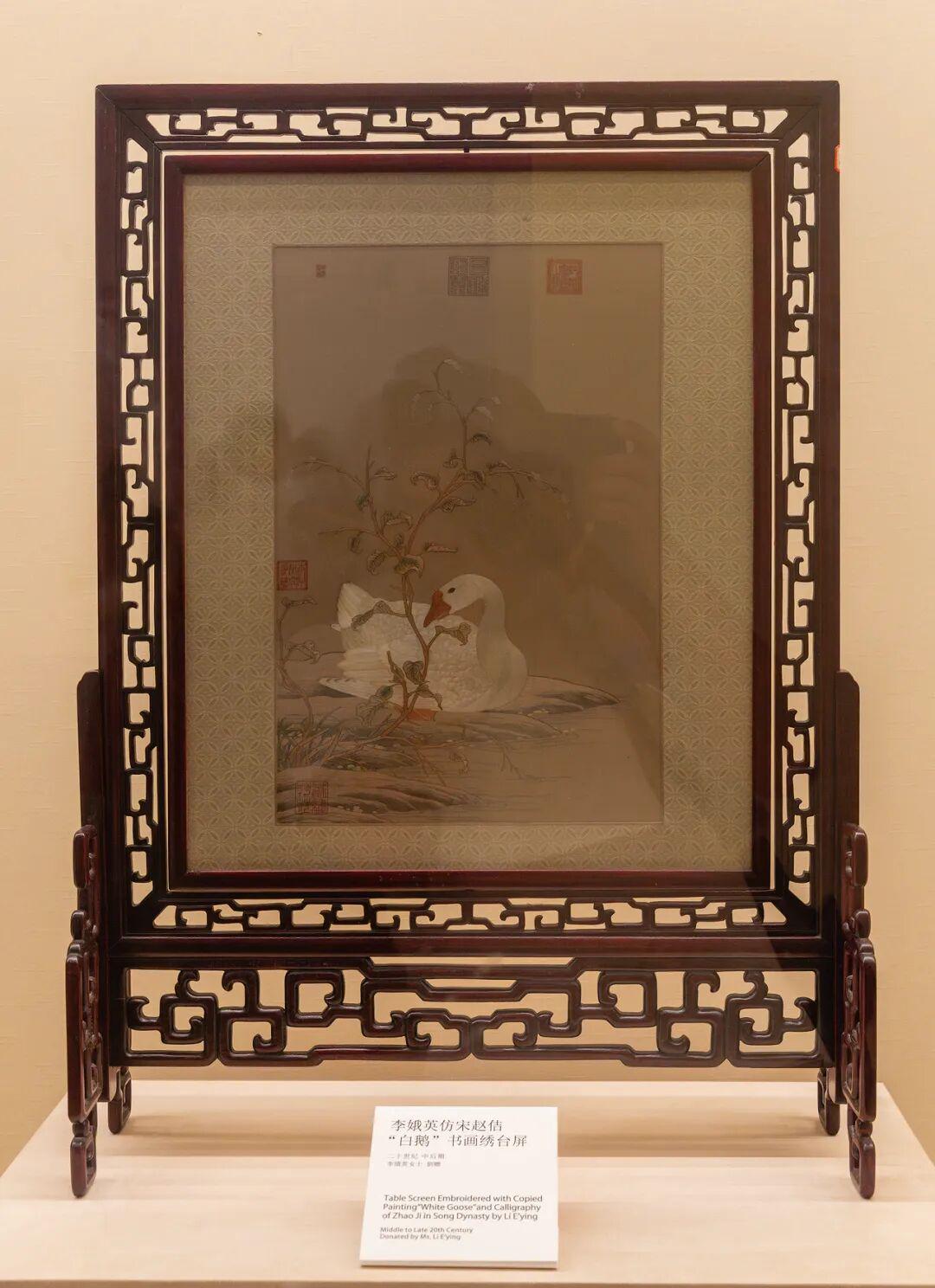 ↑ 苏州工艺美术大师、第一批非遗传承人李娥英女士,仿宋赵佶“白鹅”书画绣台屏(赵佶是艺术家,该把皇位让出来啊)