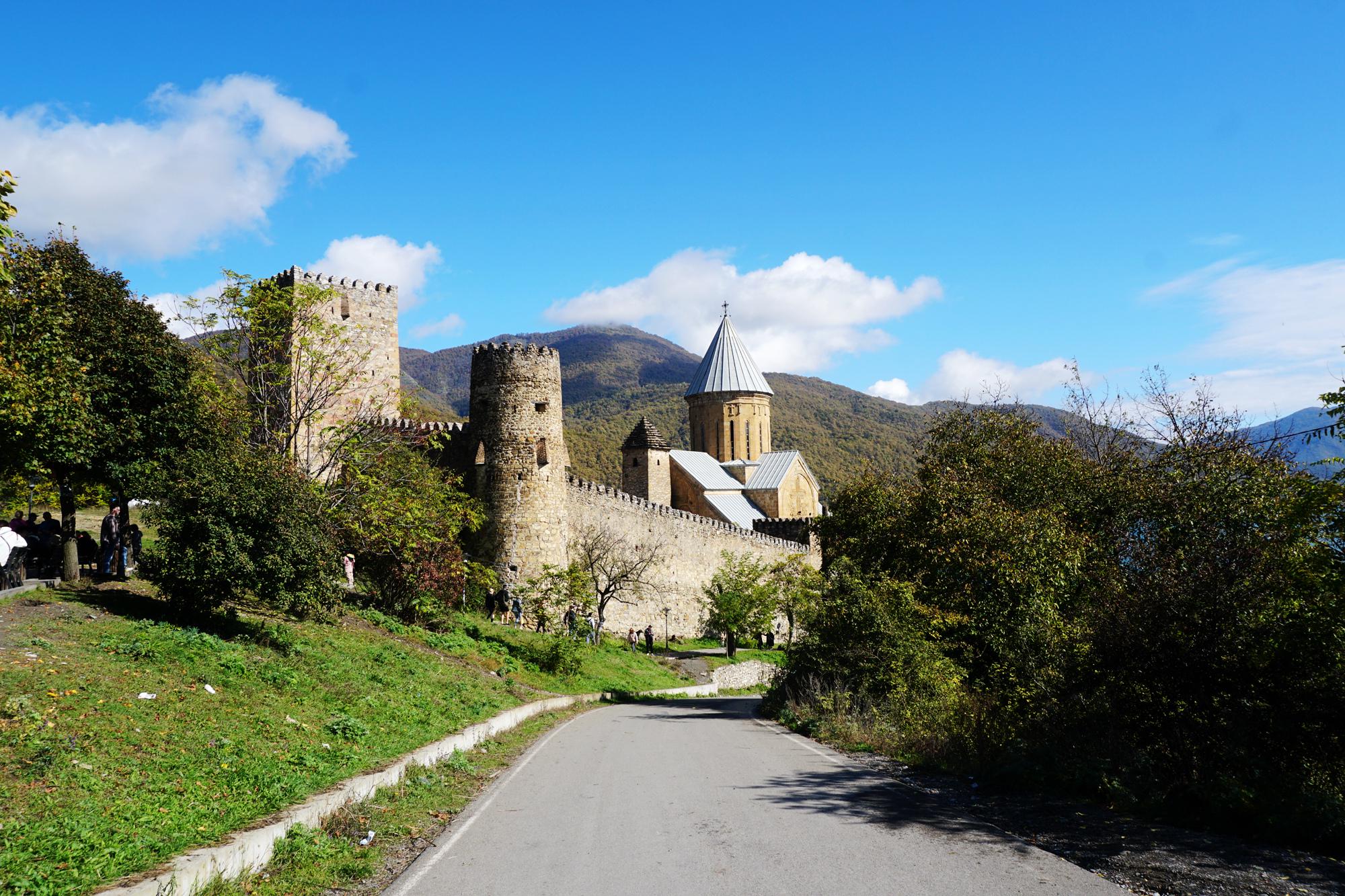 建筑由上下两座堡垒和两座17世纪的教堂组成,城堡之间有一道锯齿状的幕墙,上面的防御工事有一座方形塔楼和一座圆形塔楼。城堡内的瞭望塔值得一爬,楼梯较为狭窄陡峭,人群在这拥堵浪费了不少时间。爬到塔楼的顶端,可以看到两座教堂及中间塔楼的尖顶连成一条完美直线,可俯瞰整个城堡与湖光山色相映成趣,是格鲁吉亚的国家地理名片之一。